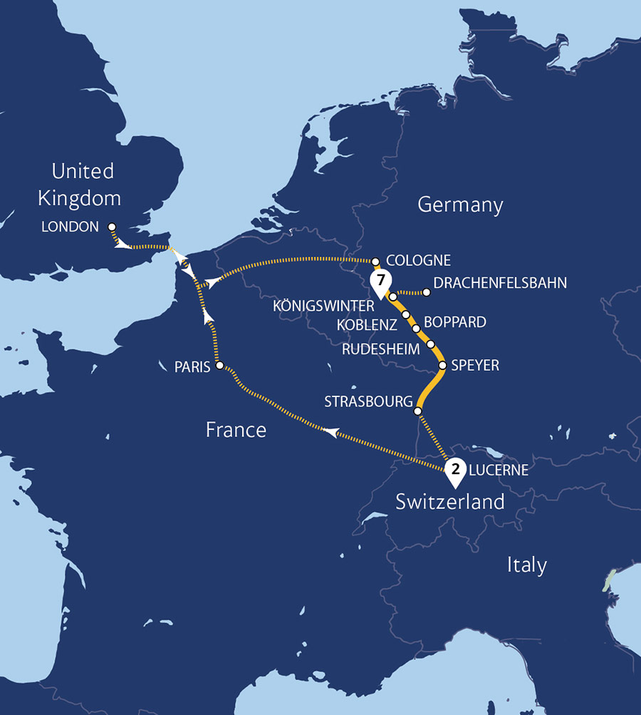 This scenic cruise along the River Rhine is a picturesque journey through captivating towns and cities. Glide past enchanting landscapes and explore the historical wonders of Heidelberg, the medieval charm of Strasbourg, and the breathtaking vistas of the Rhine Gorge. Starting from Cologne, our journey upstream leads us to the town of...
