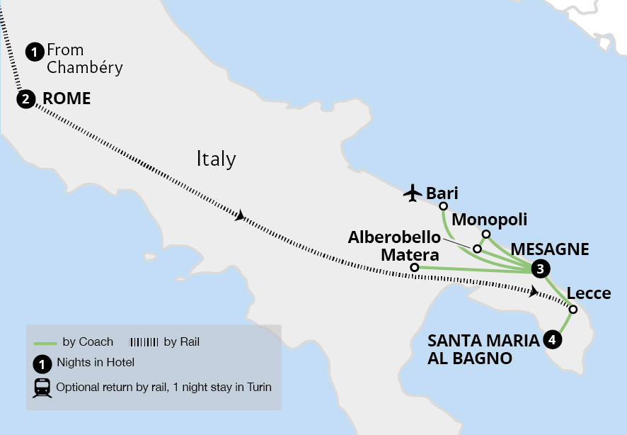 Arriving by plane, enjoy our scenic base in a hotel overlooking the coast of Monopoli. From here, experience the incredible sights and traditions of Puglia, a place untouched by the hands of time. Rich with UNESCO World Heritage sites, discover the spectacular trulli homes of Alberobello and the sassi cave dwellings in the cliffside town...