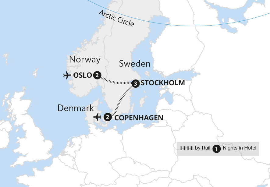 • Travel by rail through to the capitals of Norway, Sweden and Denmark