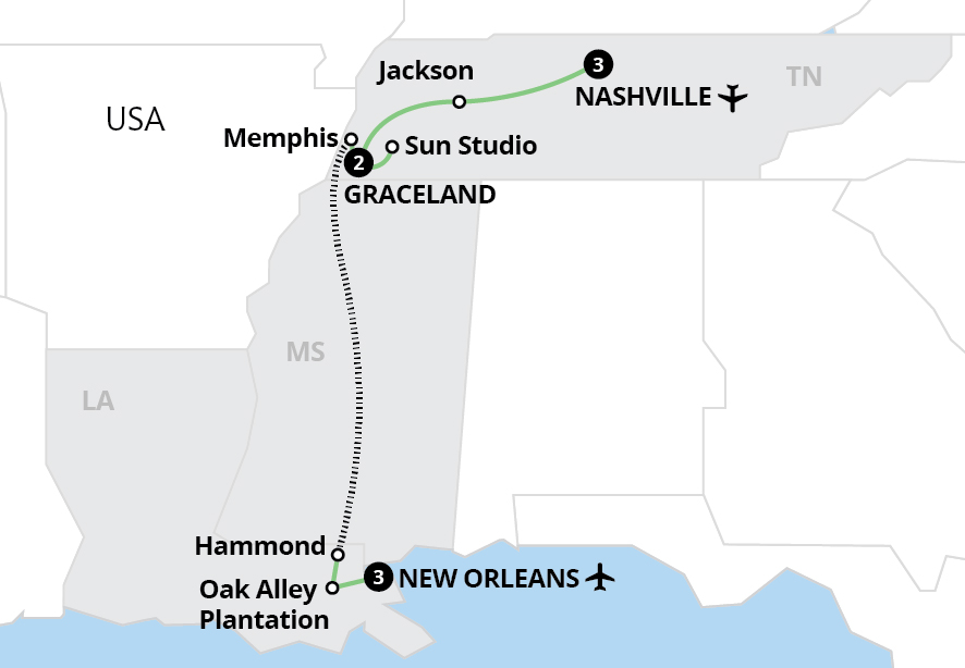 Explore Nashville, Memphis and New Orleans' links to iconic musicians, embracing the heartlands of country, rock'n'roll and blues before travelling through Mississippi by rail to uncover the birthplace of jazz. During this musical journey, step into the world of Elvis Presley at his Graceland home, spend an evening at the Grand Ole Opry,...