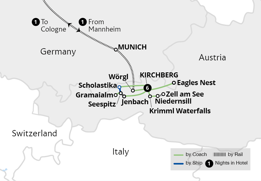 Uncover the region's culture and history from a base in Kirchberg, a charming Tyrolean town of part-timbered chalets nestled amid gentle mountains and extensive alpine pastures. Experience amazing alpine views while travelling aboard the Achensee Railway to the 'Tyrolean Sea', followed by a short boat ride and a visit to the idyllic Gramai Valley...