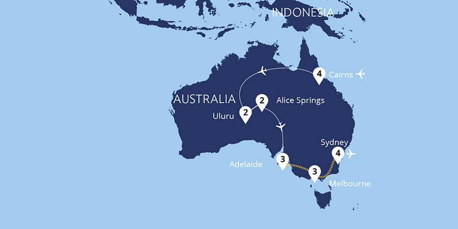 Join us on an epic adventure into this vast, vibrant and varied land to experience Australia's stunning natural wonders, from the rainforests of tropical Cairns and kaleidoscopic hues of the Great Barrier Reef to the burnished red tones of the ancient sacred site of Uluru. Explore Adelaide and its acclaimed wine region, discover the sights...