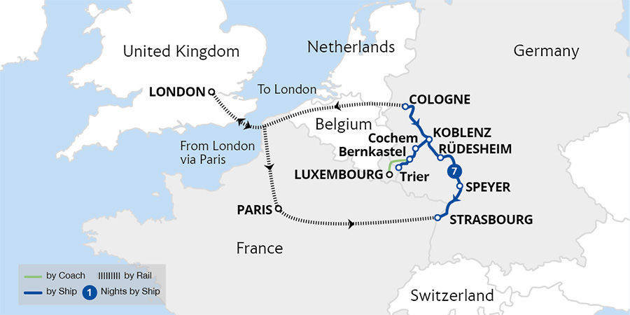 A festive cruise through Europe's most enchanting Christmas destinations on the Rhine river. Scenic landscapes and charming towns come alive with seasonal cheer as we sail through Germany and France during the most wonderful time of the year. From the twinkling lights of Koblenz's historic streets to the captivating markets of Rüdesheim,...