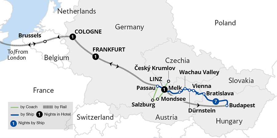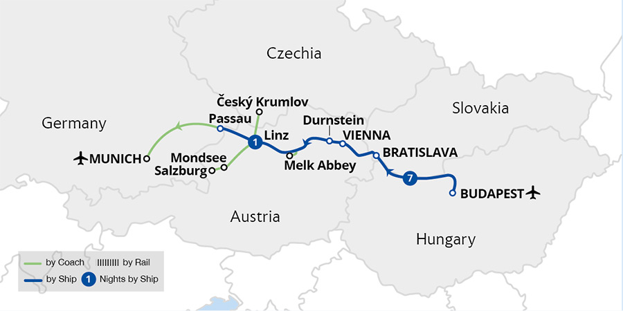 Enjoy a leisurely cruise through four countries and three capital cities, basking in beautiful river scenery all the way. Sail from the German town of Passau through the Austrian wine-growing region of the Wachau Valley, admiring picturesque Dürnstein and Melk Abbey enroute. After exploring imperial Vienna, the captivating Hungarian capital...