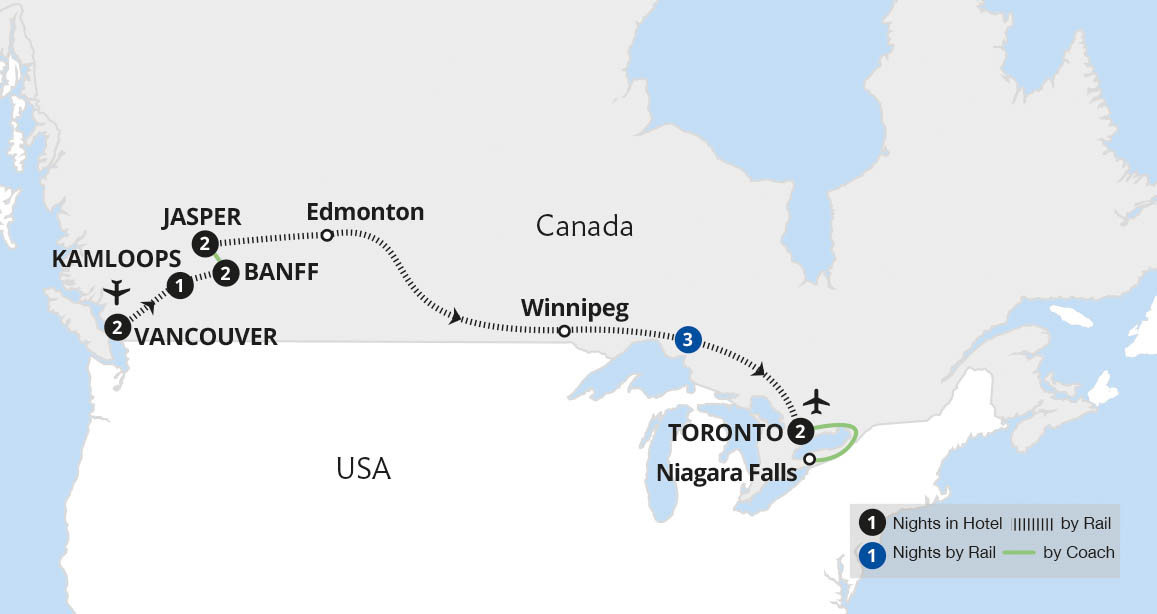 An epic three-night journey carries us across central Canada's varied scenery on our way to cosmopolitan Toronto, where we take a cruise to view the natural wonders of Niagara Falls.
