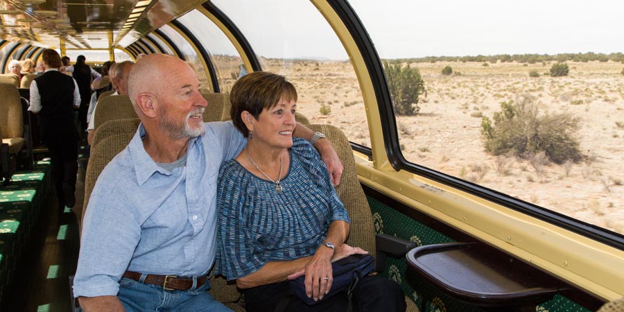 First Class passengers enjoy complimentary coffee, pastries, fruit and soft drinks, whilst alcoholic drinks can be bought at the bar. Dome Class passengers obtain fabulous views of the Grand Canyon's diverse scenery in a car which features panoramic viewing windows and a domed glass ceiling. Upholstered high-back chairs add to the luxurious feel, whilst complimentary fresh fruit, pastries, coffee and juice are offered and, on the return journey, a glass of sparkling white wine. The ultimate in Grand Canyon Railway luxury travel is reserved for passengers in the Parlour Car. Elegantly decorated and lavishly furnished, this special carriage offers lounge-style comfort, its own private bar and an open-air viewing platform. Passengers in the parlour car enjoy the same complimentary benefits as those in Dome Class.